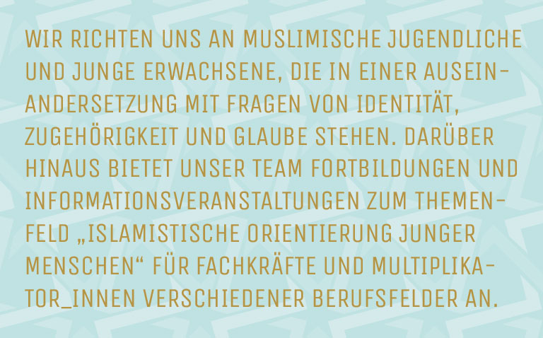 Das Team JAMIL richtet sich an Jugendliche und junge Erwachsene, die sich in religiösen Hinwendungsprozessen zum Islam befinden. Diese Jugendlichen stehen in einer Auseinandersetzung mit Fragen von Identität, Glaube und Zugehörigkeit und sympathisieren dabei möglicherweise mit dem Gedankengut des politischen oder dschihadistischen Salafismus. JAMIL greift in seiner Arbeit den Bedarf einer Angebotsstruktur an sozialraum- und lebensweltorientierter Jugendarbeit auf, die sich der Identitätsfindungsprozesse und religiösen Orientierungssuche junger Menschen annehmen kann.