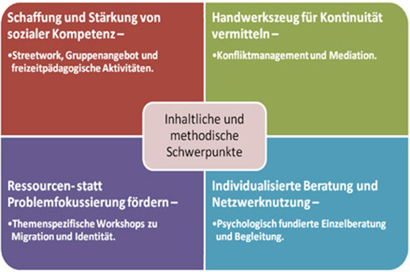 Das Angebot besteht aus einer Kombination aus Streetwork, regelmäßigen Gruppentreffen, freizeitpädagogischen Aktivitäten, themenspezifischen Workshops sowie psychosozialer Beratung, Einzelfallhilfe und Mediation. Inhaltliche Schwerpunkte des Angebots sind die Förderung gesellschaftlicher Grundqualitäten, wie z.B. soziale Fähigkeiten und Durchhaltevermögen. Dadurch werden eine sinnvolle Freizeitgestaltung, konstruktive Konfliktlösungsstrategien, Möglichkeiten zur gewaltfreien Kommunikation und deeskalierende Techniken erarbeitet. Das Erleben von Gleichberechtigung, der Abbau von Vorurteilen sowie die Reflexion eigener Rollen, aber auch das Erkennen eigener Fähigkeiten sowie die Förderung transkultureller Kompetenzen stellen zentrale Aspekte des Projektes dar.